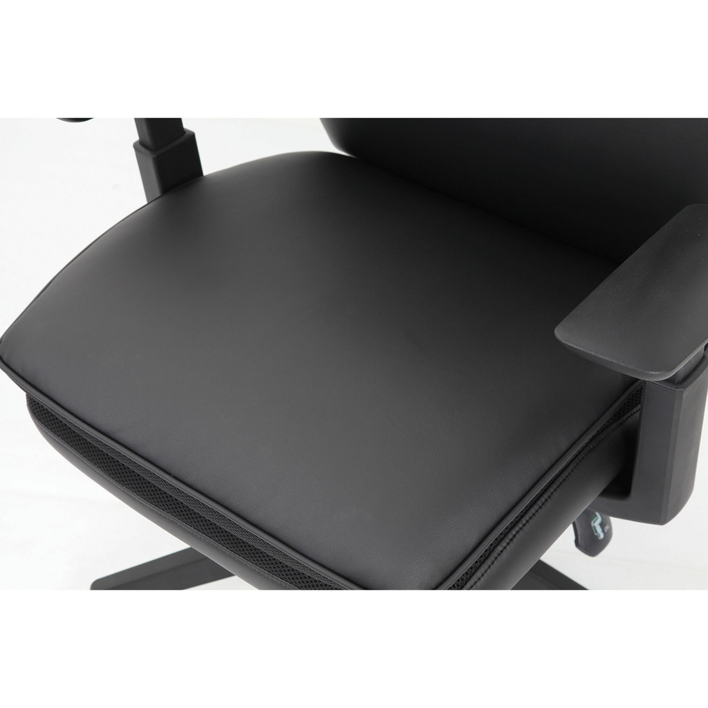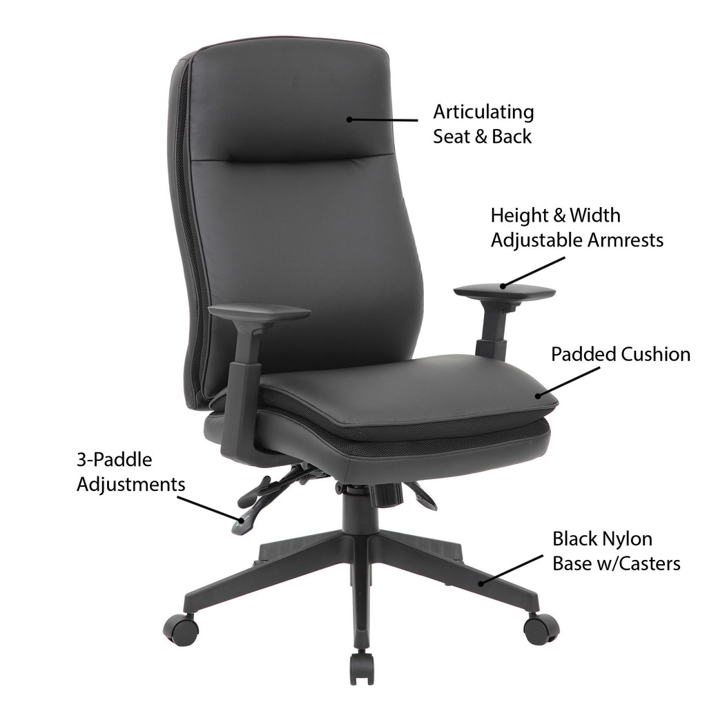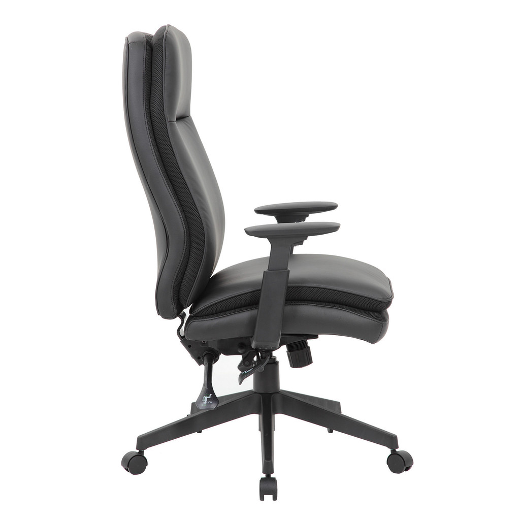 This modern high back executive task chair brings the ultimate in comfort and style to the office, featuring durable PU Leather upholstery and high-back styling with exemplary lumbar support and height adjustable arms. In addition, the chair features a pneumatic gas lift seat height adjustment, adjustable tilt tension control and a multi-function 3 paddle mechanism. Its high crown, large 27” 5 star nylon base provides stability and mobility thanks to its five hooded double wheel casters.